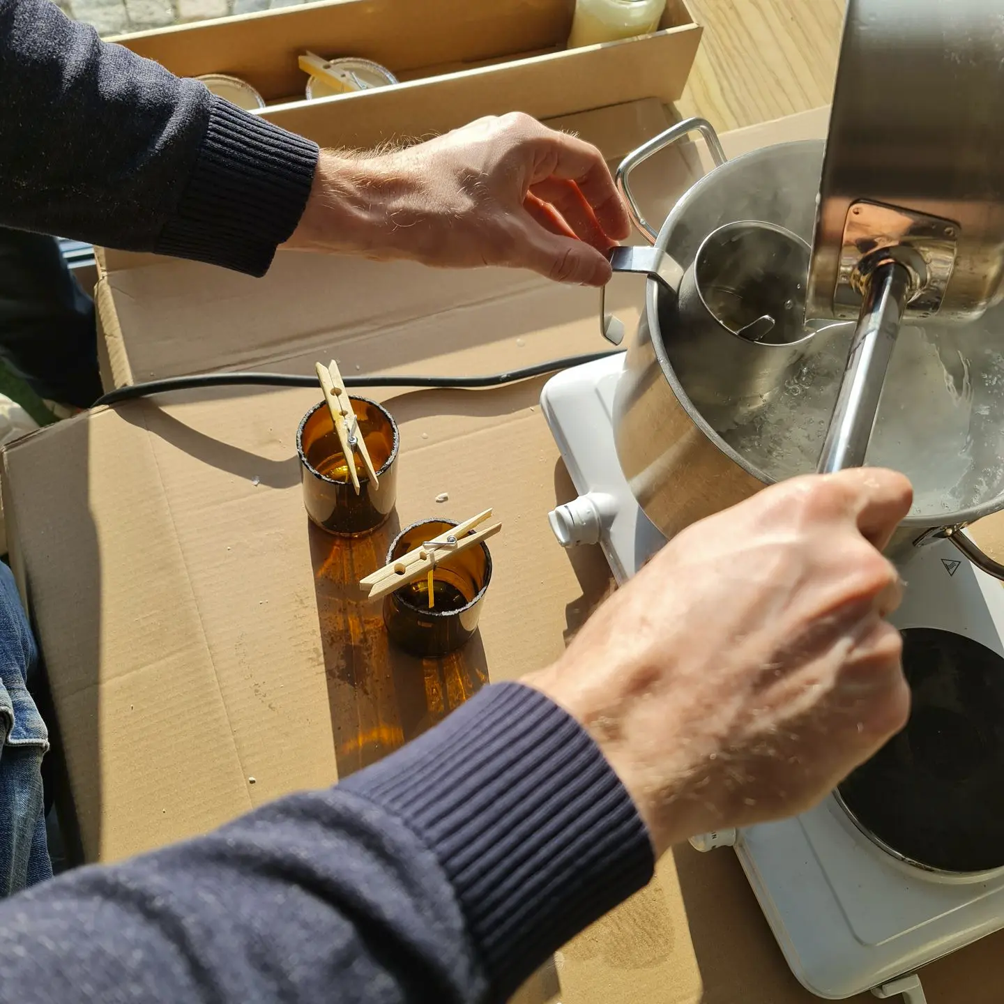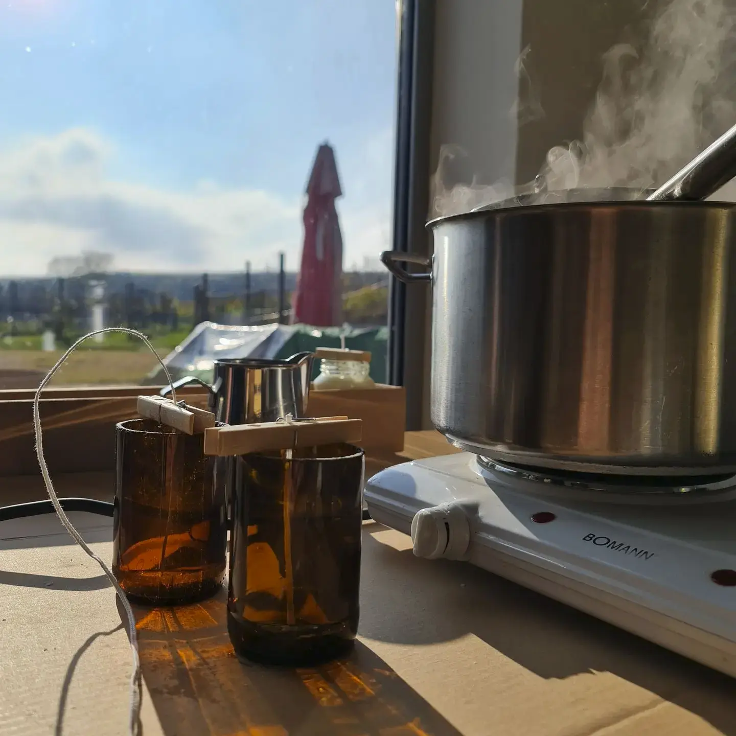 Wir verwenden nachhaltiges Recyclingwachs aus altem Speisefett und setzen auf Glasgefäße, die wir anfangs aus alten Bier- und Weinflaschen herstellten. Auch wenn dieser Ansatz nicht perfekt funktionierte, zeigt er unseren ständigen Einsatz für Nachhaltigkeit.